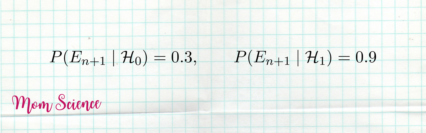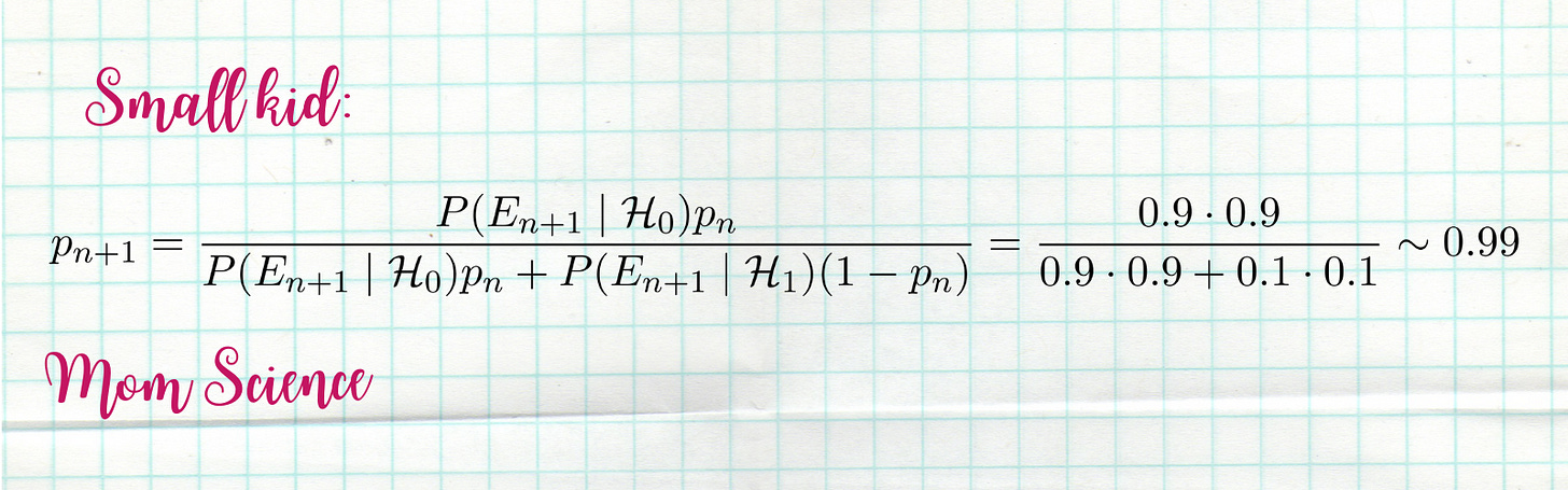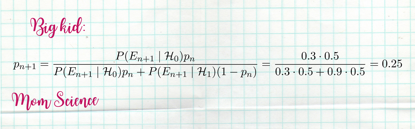 Let’s say we receive new evidence: Eₙ₊₁. It means that we have already had evidence E₁, ..., Eₙ, and there already is a guess for the chance of Santa being real based on these. Call it pₙ. This will be our a priori guess in this round of the inference process. All we need is to adjust it using the brand new information Eₙ₊₁. How do we do that? We use the formula we just derived, estimate the probability of the null and alternative hypotheses with our best guess so far, pₙ and 1-pₙ, and define the new estimate as