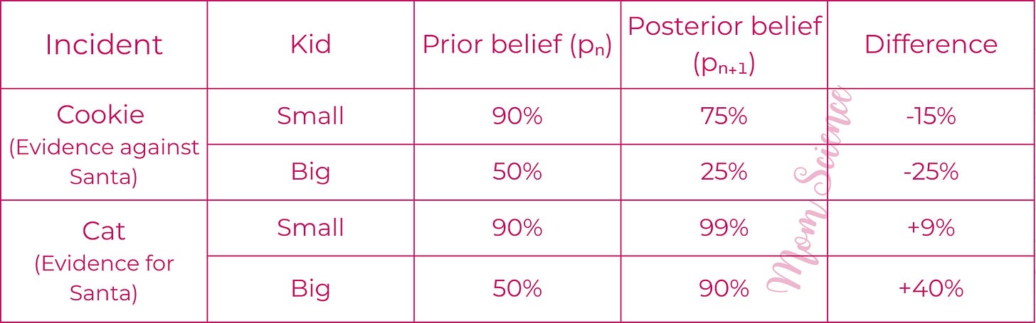 There is another important factor that goes into the updating of said belief-meter: those already in doubt are more sensitive to Santa’s screw-ups. Others with a solid belief are not. All in all, the same event has a different effect on kids with different a priori beliefs.