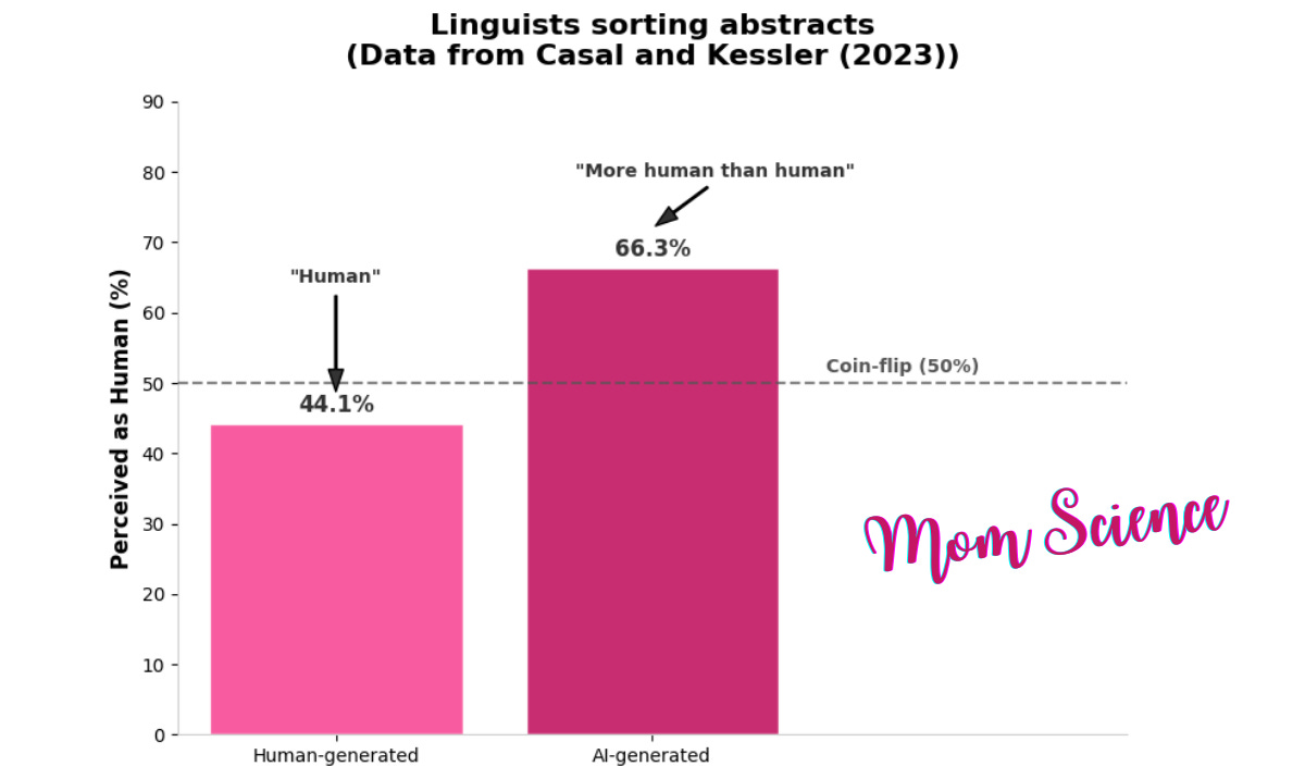 Looking at the results, you could feel that there must be people who are superior at spotting AI-generated texts. And who would be better than frequent reviewers from the top linguistic journals? In another study2, these highly qualified professionals were asked to decide whether abstracts (the summaries at the beginning of scientific papers) were written by humans or AI. And they failed miserably. They performed so poorly that they would have done better flipping most of their answers: their accuracy in choosing AI or human was on average 38.9%. They were a little better at identifying a human-written text as human-written, with a success rate of 44.1%; for AI, the rate of identification was only 33.7%. This is way below the 50% accuracy of a coin toss. As I read the results, I was equally surprised and panicked by how helpless we are, but on second thought, I think the reviewers were given an incredibly hard task with this one.