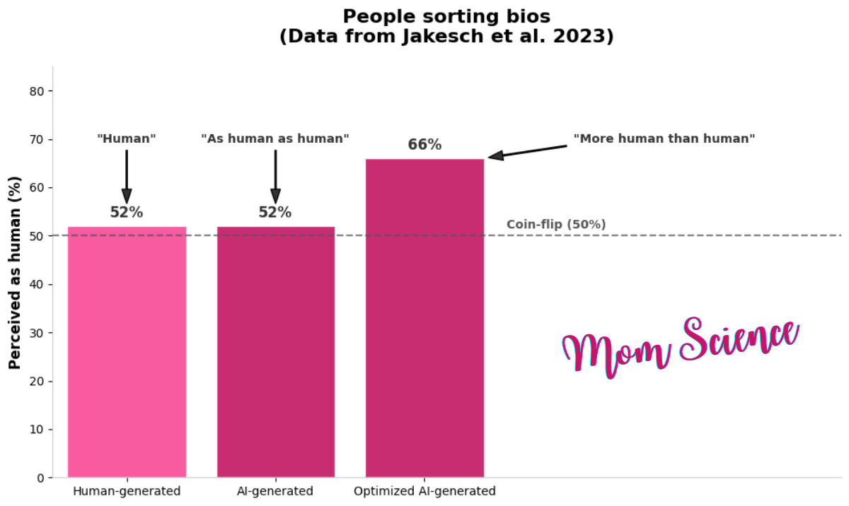 After gathering this knowledge on what heuristics people relied on in order to make a decision, the researchers validated their findings by showing that AI writers can appear “more human than humans” if given these guidelines. When prompted to mislead by paying attention to these cues, their texts were chosen as human-written with about 66% probability—compared to the actual human ones with about 52%. Menacing, isn’t it?