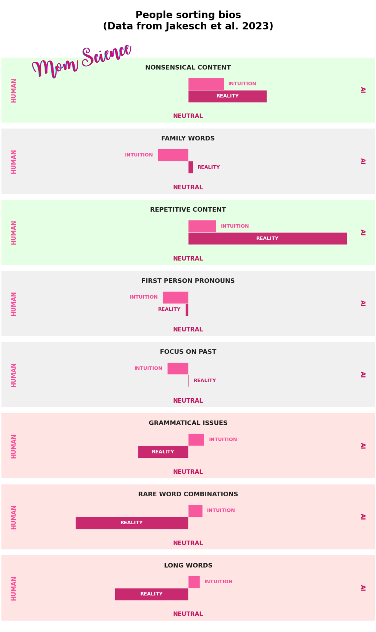 Grammatical issues, for example, were on their list of evidence for AI writers. However, the researchers showed the opposite: these were actually more common in the humans’ writings. It seems that at the time of the experiment, people still attributed bad grammar to AI. The same held true for long words and rare word combinations. Some other cues the participants relied on were not indicative of AI or humans either—such as the use of first-person pronouns, focusing on the past, or family words—yet they perceived them as signs of a human writer. They would have performed much better by relying on cues that are actually functional for detecting an AI writer, like nonsensical or repetitive content.