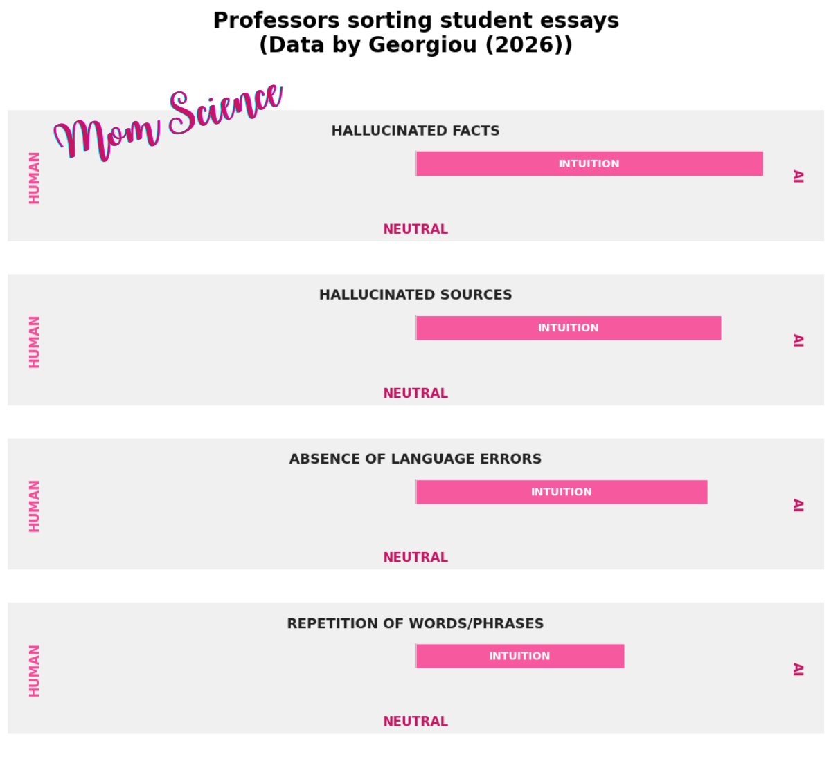 To get a more recent view of how the focus has shifted from blaming AI for making grammatical errors, I read a study3 where university professors were asked about the cues they rely on to determine if students’ essays were written by AI. No classification test was involved this time; they just discussed and rated the features they use to make a decision. Their top four cues attributed to AI were hallucinated facts and hallucinated sources, and as you could guess, the absence of language errors. The fourth was repetition. I agree that hallucinated facts really are tell-tale signs of AI since students rarely make up non-existent journals or papers, and professors have a way of validating facts and sources. However, the presence of errors shifting from an AI attribution to a human one doesn’t seem like a very stable cue.
