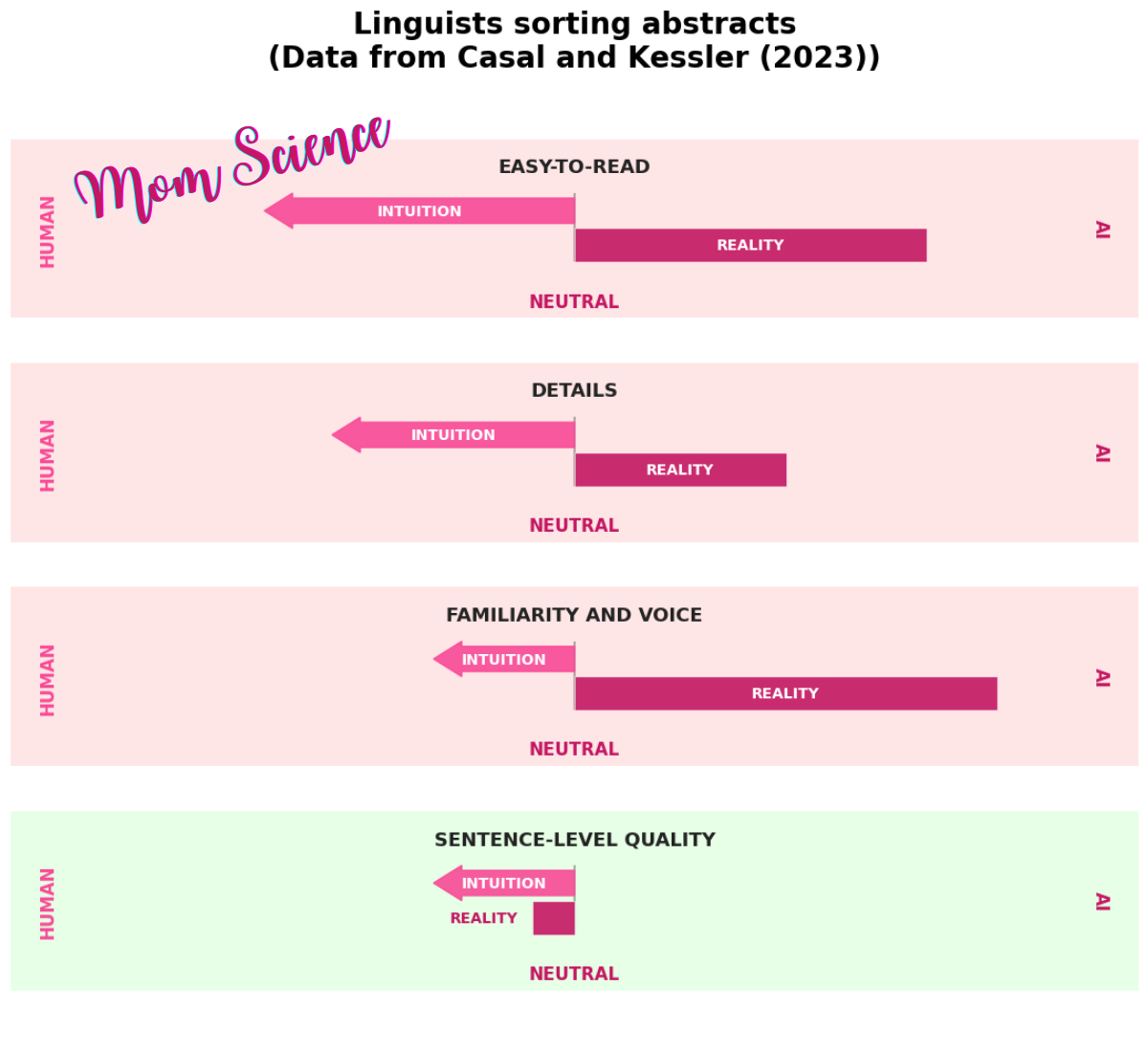 The fourth is the one I would call the functional cue out of the four, which is writing quality on a sentence level. Not the same as grammatical error, but how well-constructed sentences were: if it’s good, they assumed human, otherwise AI. This cue led to 60% correct identification, which is way better than the previous ones.